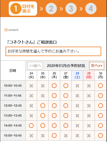 「予約可能」枠が「〇」、「予約不可」枠が「×」で表示されます。