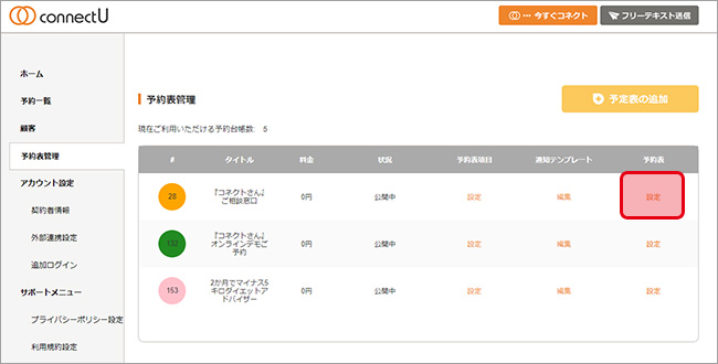 「予約表管理」より、予約枠の作成をしたい予約表の「予約表」「設定」を選択します。