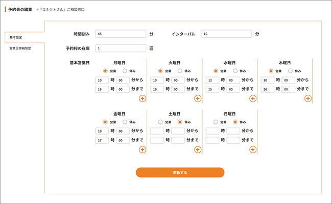時間刻み: 予約ができる1コマ何分にするのかを半角数字で設定します。