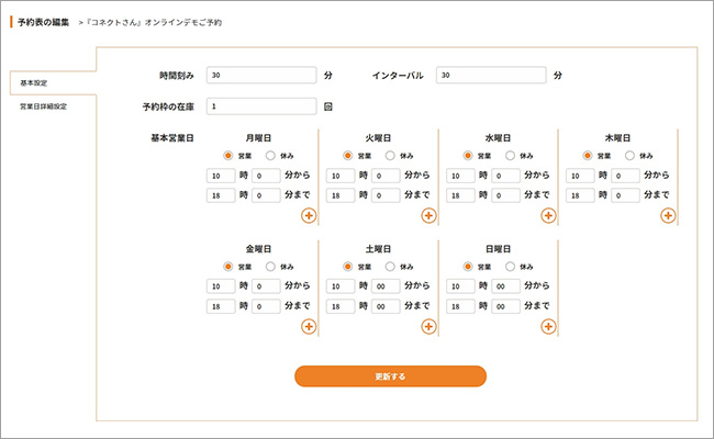 1コマを30分、インターバルを30分、営業時間を月曜日から日曜日の10時〜18時に設定した場合。
