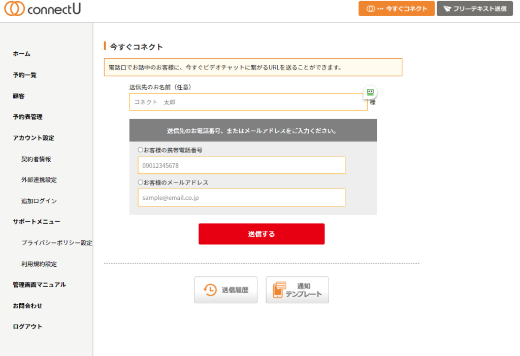 リニューアル管理画面では「今すぐコネクト」と「フリーテキスト送信」ボタンが右上に移動いたしました。