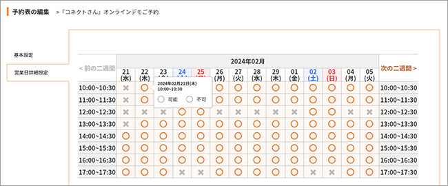(※カーソルを合わせても「可能」「不可」の表示が出ない場合は、「予約台帳の編集」での設定変更が必要です。)