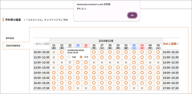 変更したい日時にカーソルを合わせると「可能」「不可」のラジオボタンが表示されます。「可能」から「不可」に変更したい場合は「不可」のラジオボタンを選択し、「不可」から「可能」に変更したい場合は「可能」のラジオボタンを選んでください。