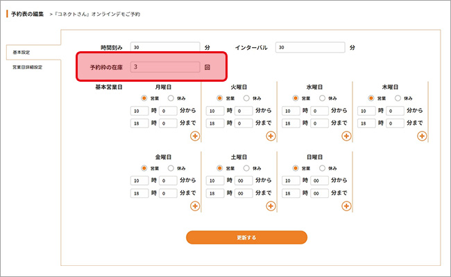 予約枠の在庫を複数にすると、設定した数分、ひとつの予約枠で予約を受け付けることが可能になります。